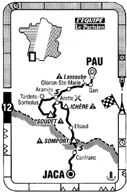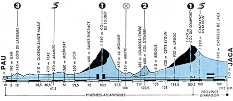 10h45 (Pyrénées-Atlantiques) : Pau - N134 Jurançon (km 0) - Gan (km 5) - D24 Côte de Lasseube (km 10-GPM3) - Lasseube (km 15.5) - Goès (km 26) - Oloron-Sainte-Marie (km 28.5) - D919 Oloron-Saint-Pé (km 31.5) - Féas (km 36.5) - Ance (km 38) - Aramits (km 41.5-sprint) - D918 Lanrie (km 45.5) - Montory (km 51) - Tardets (km 54) - D26 Laguinge (km 56) - Licq (km 59.5) - D113 La Caserne (km 67) - Sainte-Engrâce (km 72) - Col de Suscousse (km 80) - Col de Soudet (km 83.5-GPM1) - D132 La Mouline (km 97.5) - Arette (km 104-ravitaillement) - D241 Lourdios-lchére (km 117) - Col d'Ichère (km 120.5-GPM2) - Bedous (km 130) - Cette-Eygun (km 138) - Etsaut (km 142) - Urdos (km 146.5) - Col du Somport (km 160.5-GPM1) - (ESPAGNE) - (Huesca) : N330 Candanchu (km 163.5)- Canfranc Estacion (km 168-sprint) - Canfranc (km 172.5) - Villanua (km 177) - Castiello de Jaca (km 184) - entrée Jaca (km 189.5) - Jaca/Rte de Pampelune (km 192).