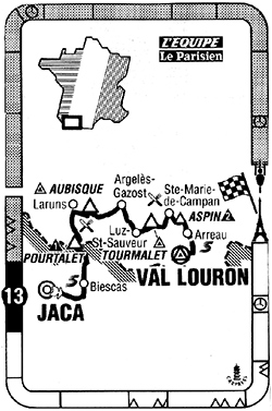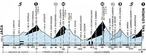 8h45 (ESPAGNE) - (Huesca) : N330 Jaca (km 0) - N260 Senegue (km 18.5) - Escuer (km 24) - Biescas (km 28-sprint) - C136 Escarilla (km 142) - Formigal (km 49.5) - Col du Pourtalet (km 56-GPM1) - (FRANCE) - (Pyrénées-Atlantiques) : D934 Artouste (km 69.5) - Gabas (km 71.5) - Eaux-Chaudes (km 80) - D918 Eaux-Bonnes (km 88-ravitaillement) - Gourette (km 96) - Col d'Aubisque (km 100-GPM HC) - (Hautes-Pyrénées) : Col du Soulor (km 110) - Arrens (km 117.5) - Marsous (km 119) - Aucun (km 120) - Arras-en-Lavedan (km 126) - Argelès-Gazost (km 129.5) - D921 Pierrefitte-Nestalas (km 135) - Soulom (km 136) - Esquièze-Sère (km 146.5) - Luz-Saint-Sauveur (km 147.5) - D918 Esterre (km 148.5) - Barèges (km 155) - Col du Tourmalet, souv. HD (km 166-GPM HC) - La Mongie (km 170) - Gripp (km 178) - Sainte-Marie-de-Campan (km 183-ravitaillement) - La Séoube (km 186.5) - Col d'Aspin (km 196-GPM2) - Arreau (km 208.5) - D618 Bordères-Louron (km 213.5-sprint) - D25 Estarvielle (km 220) - Armanteule (km 221) - Génos (km 225.5) - Val Louron (km 232-GPM1)