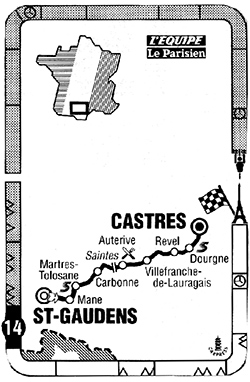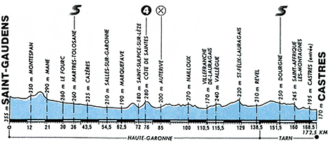 12h00 (Haute-Garonne) - Saint-Gaudens (km 0) - Miramont-de-Comminges (km 1.5) - D21 Pointis-Inard (km 7) - Montespan (km 12) - Figarol (km 15) - D2 Mane (km 21) - D113 Salies-du-Salat (km 23.5) - Mazéres-sur-le-Salat (km 27) - Le Fourc (km 30) - N117 Boussens (km 32) - Martres-Tolosane (km 36-sprint) - D10 Palaminy (km 41) - Cazères (km 43.5) - Saint-Julien (km 50) - Salles-sur-Garonne (km 54.5) - Carbonne (km 58.5) - Marquefave (km 62.5) - D622 Capens (km 66) - Saint-Sulpice-sur-Lèze (km 72) - Côte de Saintes (km 76.5-GPM4) - Lagrâce-Dieu (km 80.5) - Auterive (km 85-ravitaillement) - Nailloux (km 100) - Gardouch (km 108) - Villefranche-de-Lauragais (km 110.5) - Vallègue (km 115.5) - Saint-Félix-Lauragais (km 129) - Revel (km 138.5) - (Tarn) : D85 Sorèze (km 144.5) - Dourgne (km 151.5) - En Calcat (km 153.5) - Verdalle (km 155.5) - Saint-Affrique-les-Montagnes (km 160) - entrée Castres (km 168.5) - Castres/Av. de Lamelhié (km 172.5).