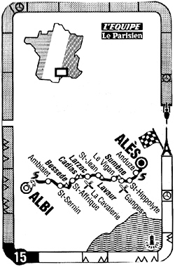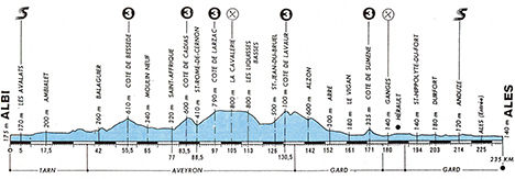 10h20 (Tarn) : Albi - D100 Saint-Juéry (km 0) - D172 Les Avalats (km 5-sprint) - Marsal (km 9) - Fabas (km 12) - Ambialet (km 17.5) - (Aveyron) : Balaguier (km 42) - Bajaguet (km 43.5) - D999 St-Sernin-sur-Rance (km 46.5) - Bessède (km 54.5) - Côte de Bessède (km 55.5-GPM3) - Moulin Neuf (km 65) - Vabres L'Abbaye (km 73) - St-Afrique (km 77) - D993 Côte de Cadlas (km 83.5-GPM3) - D 3 Saint-Rome-de-Cernon (km 88.5) - D999 Côte de Larzac (km 97-GPM3) - La Cavalerie (km 105-ravitaillement) - Les Liquisses Hautes (km 112.5) - Les Liquisses Basses (km 113) - Nant (km 119.5) - Saint-Jean-du-Bruel (km 126) - Côte de Lavaur (km 130.5-GPM3) - (Gard) : Alzon (km 142) - Arre (km 152) - Bez (km 153) - Cavaillac (km 158) - Le Vigan (km 161) - Pont d'Hérault (km 166) - D11 Côte de Sumène (km 171-GPM4) - Sumène (km 174) - (Hérault) : D4 Granges (km 180-ravitaillement) - D999 Moules-et-Baucels (km 183.5) - (Gard) : Sainte-Hyppolyte-du-Fort (km 194) - D982 Durfort (km 203) - Tornac (km 209.5) - La Madeleine (km 211) - D907 Anduze (km 214-sprint) - D910 Bagard (km 220.5) - Saint-Christol-lès-Alès (km 223) - N110 entrée Alès (km 225) - Alès/Quai Boissier de Sauvage (km 235).
