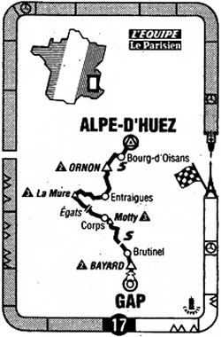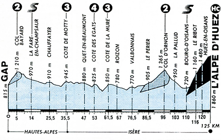 13h30 (Hautes-Alpes) - N185 Gap (km 0) - Col Bayard (km 5-GPM2) - Brutinel (km 12) - La Fare-en-Champsaur (km 14-sprint) - La Guinguette (km 22) - Chauffayer (km 25.5) - Le Motty (km 33) - Côte de Motty (km 35.5-GPM3) - (Isère) : Corps (km 38) - Quet-en-Beaumont (km 47) - La Salle-en-Beaumont (km 50.5) - Côte des Egats (km 53-GPM4) - Les Egats (km 53.5) - Les Terrasses (km 55.5) - Côte de la Mure (km 61.5-GPM3) - D26 Roizon (km 67) - Sievoz (km 69.5) - D526 Valbonnais (km 76.5) - Entraigues (km 79.5) - Le Périer (km 86.5) - Les Daurens (km 89) - La Chalp-de-Chantelouve (km 90.5) - Chantelouve (km 92.5) - Col d'Ornon (km 96-GPM2) - Ornon/Le Rivier (km 99.5) - Ornon/Pont des Oulles (km 101.5) - La Pallud (km 103) - La Paute (km 107.5) - N91 Bourg-d'Oisans (km 110-sprint) - D211 La Garde (km 114) - Le Ribot (km 116) - Huez-en-Oisans (km 120) - Alpe-d'Huez /Station (km 122.5) - L'Alpe d'Huez (km 125-GPM HC).
