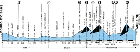9h00 (Isère) : N91 Bourg-d'Oisans (km 0) - N91 Rochetaillée (km 5.5) - Livet (km 12) - Riouperoux (km 15.5) - Les Clavaux (km 17.5) - Gavet (km 19) - Séchilienne (km 23) - Le Péage-de-Vizille (km 28) - D101 Vizille (km 30-sprint) - D524 Vaulnaveys-le-Haut (km 37.5) - Uriage-les-Bains (km 39.5) - Gières (km 47) - D523 Murianette (km 49.5) - Domène (km 51.5) - LeVersoud (km 53.5) - Le Versoud-Pruney (km 55) - Villard-Bonnot-Lancey (km 57) - Froges (km 61.5) - Le Champ (km 62) - D523 Tencin (km 66.5) - Goncelin (km 70.5) - D525 Les Fontaines (km 73) - Côte des Fontaines (km 74.5-GPM4) - Morêtel-de-Mailles (km 75) - Sailles (km 76.5) - Saint-Pierre-d'Allevard (km 78) - Allevard-les-Bains (km 82) - D209 La Chapelle-du-Bard (km 85) - (Savoie) : D207 Arvillard (km 88-ravitaillement) - La Rochette (km 90.5) - D925 Bourgneuf (km 104) - D925 Sainte-Hélène-sur-Isère (km 117.5) - Notre-Dame-des-Millières (km 120) - Grignon (km 123.5) - Pont-Albertin (km 125) - N212 Albertville (km 127) - Ugine (km 135.5) - Montée de l'Arly (km 147.5-GPM3) - Flumet (km 149) - D909 La Giettaz (km 155) - (Haute-Savoie) : D909 Col des Aravis (km 165-GPM1) - La Clusaz (km 168) - Saint-Jean-de-Sixt (km 171) - D4 Le Grand-Bornand (km 173-ravitaillement) - Le Chinaillon (km 180.5) - Col de la Colombière (km 185.5-GPM1) - Le Reposoir (km 193.5) - Meyrolles (km 198) - Blanzy (km 200.5) - L'Étoile (km 201) - Scionzier (km 202.5) - Cluses (km 205) - D902 Côte de Châtlllon (km 212.5-GPM3) - Taninges (km 216-sprint) - D907 Verchaix (km 223) - Samoëns (km 227) - D354 Chantemerle (km 230.5) - Col de Joux-Plane (km 237.5-GPM HC) - Col de Ranfolly (km 240) - D354 Morzine (km 250) - Morzine/Les Prodains (km 255).