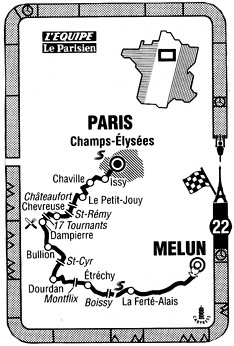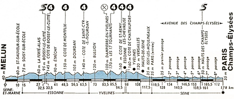 12h30 (Seine-et-Marne) : N372 Melun (km 0) - Dammarie-les-Lys (km 1.5) - D24 Orgenoy (km 8.5) - Saint-Sauveur-sur-École (km 10) - La Planche (km 11.5) - (Essonne) : D83 Soisy-sur-École (km 15) - La Ferté-Alais (km 27) - D449 Pont-de-Villiers (km 27.5) - N191 Montmirault (km 28.5) - Boissy-le-Cutté (km 32.5-sprint) - D148 Côte de Boissy (km 33.5-GPM4) - Villeneuve-sur-Auvers (km 35) - Etréchy (km 41) - Chauffour-lès-Étréchy (km 43.5) - Bois Fourgon (km 46) - Villeconin (km 47.5) - Côte de Montflix (km 48.5-GPM4) - Roinville-sous-Dourdan (km 55) - D116 Dourdan (km 56.5) - D838 Saint-Cyr-sous-Dourdan (km 62) - Côte de Saint-Cyr (km 63.5-GPM4) - Angervilliers (km 66) - (Yvelines) : D132 Bonnelles (km 70.5) - Bullion (km 73) - D149 Ronqueux (km 75.5) - Senlisse (km 91) - D91 Dampierre-en-Yvelines (km 83.5-ravitaillement) - Côte des 17 Tournants (km 85.5-GPM4) - D13 Chevreuse (km 91) - N306 Saint-Rémy-lès-Chevreuse (km 93.5) - D938 Côte de St-Rémy (km 94.5-GPM4) - Cressely (km 96) - Châteaufort (km 97) - Côte de Châteaufort (km 98-GPM4) - (Essonne) : Carrefour D838-D36 (km 98) - (Yvelines) : D938 Toussus-le-Noble (km 100) - Bue (km 102) - V4 Le Petit-Jouy (km 104.5) - N446 Jouy-en-Josas (km 105) - Versailles-Porchefontaine (km 108) - N10 Viroflay (km 110) - (Hauts-de-Seine) : Chaville (km 111.5) - Sèvres (km 114) - N187 Meudon (km 116) - Issy-les-Moulineaux ( km 117.5) - D50 Boulogne-Billancourt (km 119) - (Paris) : entrée D1 Paris (km 119.5) - Quai des Tuileries (km 125.5) - Souterrain Lemonier (km 126.5) - Place de la Concorde (km 127.5) - Av. des Champs-Elysées/1er passage (km 128) - 2e pass. (km 134) - 3ème pass. (km 140.5) - 4e pass. (km 147) - 5e pass. (km 153) - 6e pass. (km 159) - Hauts des Champs (km 161-sprint) - 7e pass. (km 165.5) - 8e pass (km 172) - Paris/Av. des Champs-Elysées (km 178).