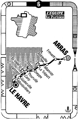 - Thierry Marie attaque au km 25. Il compte déjà 2'30" au km 30, 6' au km 37, 11'30" à Auxi le Chateau (km 49), 17' au km 64, 21'25" à Abbeville (km 76) où l'écart culmine avant de redescendre légèrement puis de repasser à 22' au km 127.