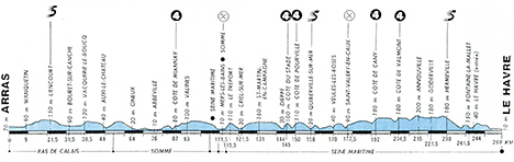 10h20 (Pas-de-Calais) : Arras (km 0) - D59 Dainville (km 0.5) - Warlus (km 4.5) - Wanquetin (km 9) - D68 Hauteville (km 12) - Avesnes-le-Comte (km 15.5) - D339 Liencourt (km 21.5-sprint) - Berlencourt-le-Cauroy (km 23.5) - Estrée-Wamin (km 25.5) - Rebreuviette (km 28) - Rebreuve-sur-Canche (km 30) - Bouret-sur-Canche (km 31.5) - Frévent (km 34) - D941 Ligny-sur-Canche (km 37.5) - Vacquerie-le-Boucq (km 39.5) - Auxi-le-Château (km 49) - (Somme) : D941 Hiermont (km 55) - Oneux (km 64) - D925 Saint-Riquier (km 67) - Abbeville (km 76) - Cambron (km 79) - Miannay (km 84) - Côte de Miannay (km 87-GPM4) - Valines (km 93) - (Seine-Maritime) : D925 Eu (km 109) - (Somme) : D.1015 Mers-les-Bains (km 111.5-ravitaillement) - (Seine-Maritime) : Le Tréport (km 115.5) - D940 Flocques (km 117) - D925 Criel-sur-Mer (km 121.5) - Biville-sur-Mer (km 127.5) - Saint-Martin-en-Campagne (km 131) - Berneval-le-Grand (km 134.5) - D920 Neuville-lès-Dieppe (km 141) - D925 Dieppe (km 144) - D75 Côte du Stade (km 145-GPM4) - Pourville-sur-Mer (km 149) - Côte de Pourville (km 150-GPM4) - Varengeville-sur-Mer (km 153) - Sainte-Marguerite-sur-Mer (km 157) - Quiberville-sur-Mer (km 158-sprint) - Saint-Aubin-sur-Mer (km 163) - D68 Sotteville-sur-Mer (km 166.5) - Veules-les-Roses (km 170) - D925 Saint-Valéry-en-Caux (km 177.5-ravitaillement) - Cany-Barville (km 190.5) - Côte de Cany (km 192-GPM4) - D17 Côte de Valmont (km 204.5-GPM4) - Thiétreville (km 206) - D10 Annouville (km 215) - Goderville (km 221.5) - D925 Hermeville (km 230-sprint) - Epouville (km 235) - Montivilliers (km 238) - D.52 Fontaine-la-Mallet (km 241.5) - D.231 entrée Le Havre (km 244) - Sainte-Adresse (km 254) - Le Havre/Pl. du Général de Gaulle (km 259).
