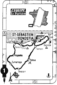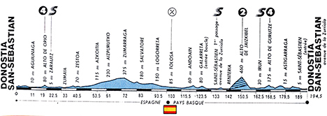 11h30 (ESPAGNE) - (Pays Basque) - San Sebastian (km 0) - N1 Anorga (km 2) - N634 Usurbil (km 7.5) - Aguinaga (km 11) - Orio (km 17) - Côte d'Alto de Orio (km 19-GPM4) - Zarautz (km 22.5-sprint) - Geteria (km 26.5) - Zumaia (km 33) - Zestoa (km 40.5) - Azpeitia (km 48) - Azkoitia (km 53.5) - Aizpurutxo (km 61) - Urextxu (km 70) - C6322 Zumarraga (km 72) - Ormaiztegi (km 79.5) - Salvatore (km 83) - Tolosa (km 103-ravitaillement) - C500 Andoain (km 115.5) - Urnieta (km 119) - C500 Hernani (km 121.5) - Galarreta (km 123.5) - entrée circuit - N1 San Sebastian (km 128) - San Sebastian/1er passage (km 133-sprint) - Pasaia Anxto (km 138.5) - Renteria (km 142) - Côte d'Alto de Jaizkibel (km 150.5-GPM2) - Hondarribia (km 159.5) - N1 Irun (km 162.5-sprint) - L500 Côte d'Alto de Gurutze (km 168.5-GPM4) - Oiartzun (km 171 - Astigarraga (km 179.5) - Hernani (km 183) - Galarreta (km 184.5) - N1 entrée San Sebastian - San Sebastian / allée de la Zurriola (km 194.5).
