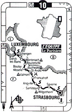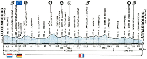 11h00 (LUXEMBOURG) - Luxembourg - Hespérange (km 0) - N3 Frisange (km 6.5) - N13 Aspelt (km 9.5) - N16 Altwies (km 12) - Mondorf-les-Bains (km 14-sprint) - CR152 Burmerange-Schengen (km 20) - Schengen (km 22.5) - (ALLEMAGNE) - B419 Carrefour B 407-B 419 (km 23.5) - (FRANCE) - (Moselle) : N153 Apach (km 24.5) - Sierck-les-Bains (km 27) - D956 Montenach (km 31) - Côte de Montenach (km 32.5-GPM4) - Kirchnaumen (km 36) - Halstroff (km 40) - Bizing (km 41.5) - Flastroff (km 44) - D19 Colmen (km 46) - Filstroff (km 50) - Bouzonville (km 53.5) - D3 Vaudreching (km 55) - Holling (km 58.5) - Eblange (km 63) - Roupeldange (km 66) - Boulay (km 69.5) - Côte de Buckwald (km 72-GPM4) - D25 Boucheporn (km 79.5) - Longeville-lès-Saint-Avold (km 83) - D22 Côte de Valmont (km 90.5) - Valmont (km 91) - Altviller (km 93) - Lixing-les-Saint-Avold (km 98.5) - Freybouse (km 102.5-ravitaillement) - D22 Fancaltroff (km 108.5) - Neufvillage (km 111.5) - D27 Marimont-les-Benestroff (km 117) - Domnon-lès-Dieuze (km 122) - Rorbach-lès-Dieuze (km 126) - Angviller-lés-Bisping (km 129.5) - Belles Forêts (km 131.5) - Langatte (km 140) - Haut-Clocher (km 142.5) - Sarrebourg (km 147.5) - D45 Buhl (km 151) - Niderwiller (km 153) - D98C Sparbrod (km 164.5) - Lutzelbourg (km 169) - (Bas-Rhin) : D132 Saverne (km 179) - D41 Maennolsheim (km 189) - Landersheim (km 192.5) - Willgottheim (km 195) - Côte de Willgottheim (km 196-GPM4) - Schnersheim (km 199.5) - Wiwersheim (km 203-sprint) - Offenheim (km 204.5) - Stutzheim (km 205.5) - Oberhausbergen (km 211) - entrée Strasbourg (km 212) - Strasbourg/Rue de la Paix (km 217).