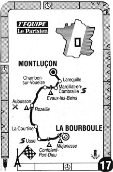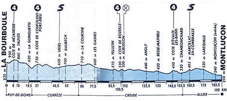 11h40 (Puy-de-Dôme) : D996 La Bourboule (km 0) - D922 Côte de Méjanesse (km 6-GPM2) - Tauves (km 10) - D29 La Guinguette (km 19.5) - (Corrèze) : D159 Côte de Confolent Port Dieu (km 27-GPM4) - D105 Bussejoux (km 31) - D45 Ussel (km 46.5-sprint) - Daubech (km 52) - (Creuse) : D982 La Courtine (km 66) - Les Gasnes (km 77.5) - Croze (km 85.5) - Felletin (km 93.5) - Moutier Rozeille (km 98.5) - Côte de Rozeille (km 100.5-GPM4) - Aubusson (près de) (km 102) - D993 Saint-Amand (km 106.5) - Montelladonne (km 116) - Angly (km 122.5) - Besse Mathieu (km 133) - Chambon-sur-Voueize (km 141) - DS915 Côte d'Evaux-les-Bains (km 145.5-GPM4) - D915 Chambonchard (km 153.5) - (Allier) : Marcillat-en-Combraille (km 160.5-sprint) - N144 Néris-les-Bains (km 178) - entrée Montluçon (km 183.5) - Montluçon / quai de Stalingrad (km 189).