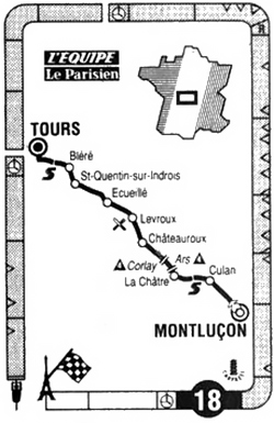 Après de nombreux démarrages, Peiper passe légèrement détaché au sprint d'Azay-sur-Cher au km 197. Elli sort avant la banderole des dix derniers kilomètres. Il est rattrapé par Frison. Au km 206, ils ont 12" à Saint-Avertin. Bugno et les PDM provoquent le regroupement avant la flamme rouge. C'est le moment que choisit pour démarrer Thierry Marie. Il est repris par Da Silva & Nijdam, mais il repasse Nijdam et gagne dans les 10 derniers mètres, résistant au retour des sprinters. C'est la 6ème victoire française sur ce Tour.