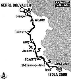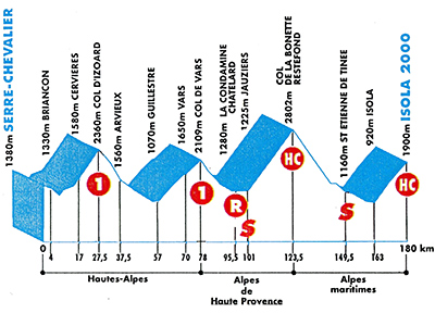 10h34 (Hautes-Alpes) : N91 Serre-Chevalier (km 0) - Chantemerle (km 1) - Briançon (km 4) - D902 Cervières (km 17) - Col d'Izoard (km 27.5_GPM1) - Arvieux (km 37.5) - Guillestre (km 57) - Vars (km 70) - Col de Vars (km 78-GPM1) - (Alpes-de-Haute-Provence) : D902 St-Paul-sur-Ubaye (km 86.5) - D 900 La Condamine-Châtelard (km 95.5-ravitaillement) - Jausiers (km 101-sprint) - Col de la Bonette Restefond (km 123.5-GPM HC) - (Alpes-Maritimes) : D64 Bousteyas (km 136) - D2205 St-Etienne-de-Tinée (km 149.5-sprint) - D2205c Isola (km 163) - D97 Montée d'Isola 2000 (km 179.5-GPM HC) - Isola 2000 / parking P1 (km 180).