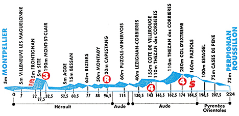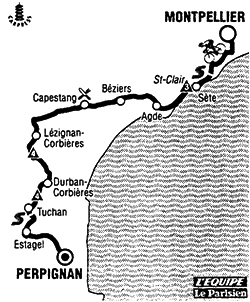 11h12 (Hérault) : D986 Montpellier (km 0) - D185 - D185 Villeneuve-lès-Maguelonne (km 7) - D114 - N112 Frontignan (km 22-sprint) - Sète (km 27.5) - Mont Saint-Clair (km 32.5-GPM3) - D912 Agde (km 52.5) - D13 Bessan (km 60.5) - D28 Béziers (km 77) - D11 Montady (km 88) - Capestan (km 96.5-ravitaillement) - (Aude) : Pouzols Minervois (km 115) - (Hérault) : carr. D11-D52 (km 119.5) - (Aude) : D611 Lézignan-Corbières (km 130.5) - D106 Ferrals-lès-Corbières (km 138.5) - Côte de Villerouge (km 143-GPM4) - Villerouge-la-Cremade (km 144.5) - D 611 Thezan-des-Corbières (km 146.5) - Durban Corbières (km 162.5) - Villeneuve-lès-Corbières (km 167.5) - Col d'Extrême (km 174-GPM4) - Tuchan (km 180) - Paziols (km 184.5-sprint) - (Pyrénées orientales) : D17 Estagel (km 198.5) - Cases de Pêne (km 207.5) - entrée N 9 Perpignan (km 220) - Perpignan / av. Palais des Expositions (km 224).