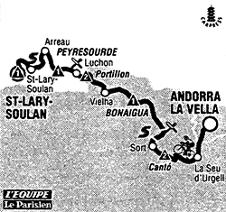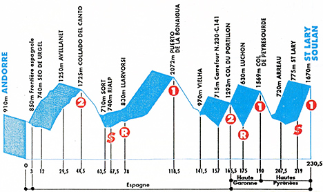 8h34 (ANDORRE) - N91 Andorra la Vella (km 0) - (ESPAGNE) - Seu de Urgel (km 12) - N260 Montferrer (km 15) - Adrall (km 18) - Parroquia d'Orto (km 21) - Avellanet (km 29.5) - Pallerols (km 31) - Collado del Canto (km 44.5-GPM2) - Rubio (km 46.5) - Vilamur (km 54) - Sort (km 63.5) - C147 Rialp (km 67.5-sprint) - Llavorsi (km 78-ravitaillement) - Escalo (km 86.5) - Guingeta (km 91.5) - Carr. C147-C 142 (km 100) - C142 Puerto de la Bonaigua (km 118.5-GPM1) - Salardu (km 132) - Arties (km 134.5) - Casarilh (km 138) - Escunhau (km 138.5) - Vielha (km 141.5) - N230 Aubert (km 145.5) - Carr. N230-C141 (km 157) - C141 Col du Portillon (km 165.5-GPM2) - (FRANCE) - (Haute-Garonne) : D618 Saint-Mamet (km 174) - D618A Luchon (km 175-ravitaillement) - Saint-Aventin (km 180.5) - Garin (km 183.5) - (Hautes-Pyrénées) : Col de Peyresourde (km 190.5-GPM1) - Borderes Louron (km 202) - Arreau (km 207.5) - D929 Cadeac-les-Bains (km 210) - Ancizan (km 212) - Guchan (km 215) - Bourisp (km 217.5) - Saint-Lary Soulan (km 219-sprint) - D123 Vignec (km 220) - Soulan (km 225) - Saint-Lary Soulan / Pla d'Adet (km 230.5-GPM1).
