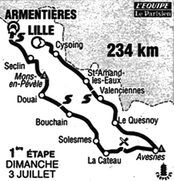 - Pour une première étape du Tour, la course a été très peu animée, une course longtemps limpide à travers la campagne nordiste. Le "sprint" de Raismes au km 36 est enlevé par Abdoujaparov devant Martinello ainsi que celui du km 159 à Aniche devant Jalabert. Une échappée de trois coureurs se forme vers le km 166 entre Écaillon et Douai : les Hollandais Van Poppel et Mulders et le Belge Frison. Ils vont prendre jusqu'à 1'30" sur un peloton emmené par les co-équipiers de Boardman et le maillot jaune lui-même. La côte de Mons-en-Pévèle (km 191.5) passée en tête par Van Poppel lui permet de prendre le 1er maillot à pois. Les Gan ont ensuite été remplacés par l'équipe de Nelissen (Novémail) qui sont restés devant jusqu'à la flamme rouge.