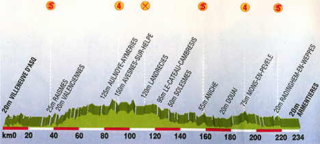 11h07 (Nord) : Lille - D941 Villeneuve d'Ascq (km 0) - Sainghin-en-Mélantois (km 3.5) - D955 Cysoing (km 8) - Saint-Amand-les-Eaux (km 30.5) - D169 Raismes (km 36-sprint) - Valenciennes (km 43.5) - D934 Marly (km 46.5) - Le Quesnoy (km 60.5) - D33 Potelle (km 63) - Berlaimont (km 76) - D951 Aulnoye-Aymeries (km 78.5) - D959 Leval (km 80) - D951 Monceau-Saint-Waast (km 83) - Côte d'Avesnes sur Helpe (km 91-GPM4) - D962 Marbaix (km 99) - Landrecies (km 110.5-ravitaillement) - Le Cateau-Cambrésis (km 122.5) - D955 Montay (km 124.5) - Solesmes (km 133) - D942 Saint-Python (km 135) - D955 Haussy (km 138.5) - Haspres (km 145) - D81 Lieu-Saint-Amand (km 150.5) - Boucham (km 153.5) - D943 Emerchicourt (km 158.5) - Aniche (km 159-sprint) - N45 Écaillon (km 163) - Douai (km 174) - Douai-Frais-Marais (km 180) - Bercée (km 188) - Côte de Mons-en-Pévèle (km 191.5-GPM4) - Thumeries (km 194) - D8 La Neuville (km 196.5) - Seclin-Martinsart (km 203.5) - D39 Gondecourt (km 208) - D62 Wavrin (km 214) - Radinghem-en-Weppes (km 220.5-sprint) - Wez-Macquart (km 225.5) - D933 La Chaussée d'Armentières (km 228.5) - Armentières / Pl. du Gal de Gaulle (km 234).