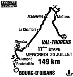 - La grosse difficulté du jour est le col de La Madeleine. La bataille y fait rage dès les premières pentes. Riis et Ugrumov attaquent avec Nelson "Cacaito" Rodriguez dans leur sillage. Derrière Leblanc semble vouloir se lancer à leur poursuite mais se relève. Virenque répond à un démarrage de Pantani ressuscité et c'est Indurain qui remet de l'ordre. Ces divers mouvements font énormément de dégâts à l'arrière avec entr'autres De las Cuevas. Au sommet (km 78.5), Ugrumov, Riis & Rodriguez précèdent le groupe maillot jaune de 1'10". De las Cuevas est pointé à 5'20".