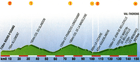 12h18 (Isère) : Bourg-d'Oisans (km 0) - D526 Allemond (km 9-sprint) - Articol (km 17) - Le Rivier-d'Allemond (km 19) - (Savoie) : D927 Col du Glandon (km 36) - Saint-Colomban-des-Villards (km 45.5) - Saint-Étienne-de-Cuines (km 57) - D213 Saint-Avre (km 58) - La Chambre (km 58.5) - Saint-François-Longchamp (km 70.5) - Col de la Madeleine (km 78.5) - D94 Celliers chef-lieu (km 88.5) - Bonneval (km 96) - D990 La Léchère (km 105-ravitaillement) - D213 Aigueblanche (km 110-sprint) - N90 Moutiers (km 112) - D915A Saint-Jean-de-Belleville (km 123) - Saint-Martin-de-Belleville (km 131) - D117 Les Menuires (km 138.5) - Val-Thorens (km 149).