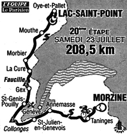 - Le peloton fait une trève et c'est au petit trot que sont parcourus les 150 premiers kilomètres sur les 208 que comptent l'étape du jour. On ne peut que noter le sprint de Viuz en Sallaz remporté par Fidanza devant Martinello, la côte de Collonges au km 80.5, passée en tête par Peter De Clercq et la facétie de Nijboer qui revêt le maillot jaune à manches longues qu'Indurain lui avait demandé d'aller chercher à la voiture du DS pour se protéger de la pluie : 2 maillots jaunes sur la course, Jean-Marie Leblanc, au contraire d'Indurain, n'a guère apprécié la plaisanterie. On note aussi l'abandon de Marc Sergeant, malade.