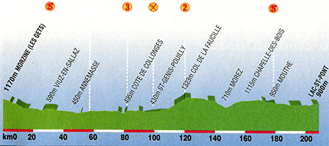 9h45 (Haute-Savoie) : Morzine (km 0) - D902 Les Gets (km 0) - Taninges (km 11.5) - D.907 Matringes (km 17) - Saint-Jeoire (près de) (km 24.5) - Ville-en-Sallaz (km 27.5) - Viuz-en-Sallaz (km 29.5-sprint) - Bonne-sur-Menoge (km 36) - Vétraz-Monthoux (km 40.5) - Annemasse (km 42.5) - Gaillard (km 46.5) - N206 Pas-de-l'Échelle (km 50) - Collonges-sous-Salève (km 55) - Saint-Julien-en-Genevois (km 59) - Essertet (km 66.5) - Vulbens-Faramaz (km 73) - (Ain) : D906 Côte de Collonges (km 80.5-GPM3) - Collonges (km 81) - D984 Farges (km 84.5) - Péron (km 87.5) - D984C St-Genis-Pouilly (km 97.5-ravitaillement) - Gex (km 106.5) - N5 Col de la Faucille (km 119.5-GPM2) - La Vattay (km 123.5) - (Jura) : D29 La Cure (km 135.5) - N5 Les Rousses (km 137) - Morez (km 146.5) - (Doubs) : D46 Chapelle-des-Bois (km 162) - Chaux-Neuve (km 172.5) - D437 Petite-Chaux (km 176) - Mouthe (km 179-sprint) - Labergement-Sainte-Marie (km 189.5) - D129 Saint-Point-Lac (km 195) - Oye-et-Pallet (km 201) - D437 Malbuisson (km 208) - Lac Saint-Point / Grande-Rue (km 208.5).