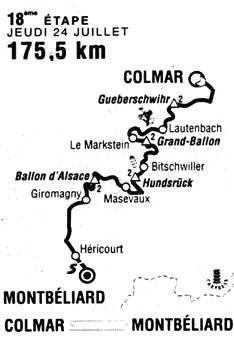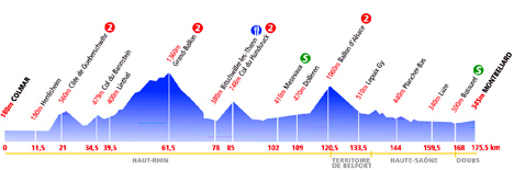 12h40 (Haut-Rhin) : Colmar (km 0) - Sundhorfen (km 2.5) - Sainte-Croix-en-Plaine (km 7) - Herrlisheim (km 11.5) - Hattstatt (km 14.5) - Côte de Gueberschwihr (km 21-GPM2) - Osenbach (km 26.5) - Soultzmatt (km 29) - Col du Bannstein (km 34.5) - Lautenbach (km 37.5) - Linthal (km 39.5) - Le Markstein (km 54.5) - Grand-Ballon (km 61.5-GPM2) - Goldbach-Altenbach (km 70.5) - Willer-sur-Thur (km 75.5) - Bitschwillef-lès-Th. (km 78.5-ravitaillement) - Col de Hundsruck (km 85-GPM2) - Bourbach-le-Haut (km 88) - Bourbach-le-Bas (km 92) - Sentheim (km 96) - Masevaux (km 102-sprint) - Sickert (km 104) - Niederbruck (km 104.5) - Oberbruck (km 108.5) - Dolleren (km 109) - Sewen (km 111) - Ballon d'Alsace / col du Langenberg (km 120.5-GPM2) - (Territoire de Belfort ) : Lepuix Gy (km 133.5) - Giromagny (km 135) - Auxelles-Bas (km 139) - (Haute-Saône) : Plancher-Bas (km 144) - Échavanne (km 152) - Chenebier (près de) (km 154) - Chagey (km 158) - Héricourt (km 162.5) - Bussurel (km 168-sprint) - (Doubs) : Béthoncourt (km 168.5) - Montbéliard / rte de Grand-Charmont km 175.5).