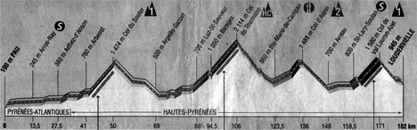 - Soulor, Tourmalet, Aspin et Val Louron sont au programme des grimpeurs aujourd'hui. Le premier sprint d'Arros-Nay au km 13.5 est remporté par Zabel. Le peloton se dirige vers un brumeux col du Soulor à un rythme assez soutenu. Leblanc est le premier attaquant dans cette ascension mais il se retrouve "dans le dur" au sommet, à 35" d'un petit peloton de 30 coureurs mené par Brochard qui défend son maillot à pois. Jalabert est à 1'15" en compagnie du maillot jaune et de Zabel. La descente s'effectue dans le brouillard et Boardman est victime d'une chute. Le regroupement s'effectue dans la vallée.