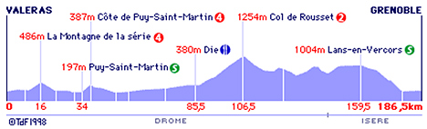 - L'avance des six atteint 8'15" au ravitaillement de Die (km 85), 9'40" au pied du col de Rousset (km 92). Au sommet du col, les fuyards menés par O'Grady, comptent 9' d'avance. Dans le peloton, les Telekom assurent un tempo léger et l'écart culmine maintenant à 12' à St-Julien en Vercors (km 138). Guesdon et Diaz s'intercalent juste avant Lans en Vercors à 30 bornes du but.