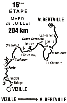- Dans les cols de La Chartreuse, les échappés maintiennent une bonne avance et Stéphane Heulot passent les sommets en tête. Derrière, un groupe de contre-attaque se forme avec Bordenave, Verbrugghe, Solaun mais ils ne peuvent réaliser la jonction et sont repris au premier ravitaillement de Pontcharra (km 88.5). A Épierre (km 129), les échappés comptent 6'30" d'avance sur le peloton. Dès les premières pentes du col de La Madeleine, Stéphane Heulot lâche ses compagnons Teteriouk et Aldag. Dans le peloton, au premier tiers de l'ascension, Ullrich accélère à plusieurs reprises et ne restent dans sa roue que Pantani, Piepoli et Escartin. Ces deux derniers cèdent rapidement et laissent Ullrich et Pantani en tête à tête. L'Allemand fait toute la montée en tête avec Pantani sur son porte-bagage. Teteriouk et Aldag sont rejoints et déposés. A 8 km du sommet, Heulot est repris et également lâché. Au col de la Madeleine (km 160.5), Ullrich passe en tête, Pantani dans sa roue, à 2'12" le groupe Julich / Escartin.