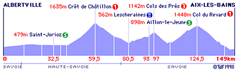 Montagnv (km 109.5) - Les Déserts (km 114) - Col de Plainpalais (km 117.5) - La Fèclaz (km 120.5) - Col du Revard (km 124.5-GPM1) - Trévignin (km 138) - Pugny-Chatenod (km 140) - Mouxy (km 142) - entrée Aix-les-Bains (km 143) - Aix-les-Bains/Bd. Barrier (km 149).