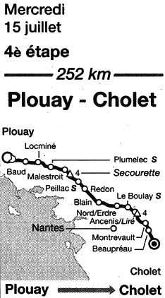 - En tête de peloton, les Mapei prennent la place des Gan et la poursuite s'intensifie. L'écart tombe alors rapidement et les deux Français sont revus au km 230, après 117 kilomètres d'échappée. Le peloton s'achemine à vive allure vers Cholet et les démarrages sont timides. Aux 2000 mètres, une chute met à terre quelques sprinters : Kirsipuu, N. Jalabert & Traversoni. Cipollini chute également aux abords de la flamme rouge. Minali mène le sprint mais Blijlevens le déborde et emporte l'étape.