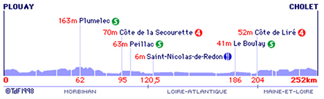 11h10 (Morbihan) : Plouay (km 0) - Lanvaudau (km 5.5) - Baud (km 26.5) - La Chapelle-Neuve (km 34) - Plumelin (km 38.5) - Locminé (km 43) - Bignan (km 48.5) - Saint-Jean-de-Brévelay (km 55) - Plumelec (km 62-sprint) - Serent (km 73) - Sous (km 79) - Malestroit (km 83) - Saint-Congard (km 92) - Côte de la Secourette (km 95.5-GPM4) - Saint-Gravé (km 98.5) - Peillac (km 102.5-sprint) - Saint-Vincent-sur-Oust (km 109) - (Ille-et-Vilaine) : Redon (km 115.5) - (Loire-Atlantique) : Saint-Nicolas-de-Redon (km 120.5-ravitaillement) - Rozay (km 136.5) - Blain (km 149.5) - Nort/Erdre (km 171.5) - Les Touches (km 177.5) - Le Boulay / Mouzeil (km 186-sprint) - Saint-Géréon (km 198) - Ancenis (km 199.5) - (Maine-et-Loire) : Lire / Côte (km 204-GPM4) - Le Fuilet (km 212) - Saint-Rémy-en-Mauges (km 216) - Montrevault (près de) (km 217.5) - Saint-Pierre-Montlimart (km 219) - Beaupréau (près de) (km 229) - Bégrolles-en-Mauges (km 237.5) - entrée Cholet (km 246) - Cholet / av. Manceau (km 252).