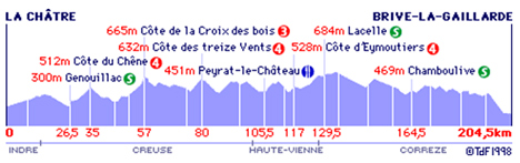 11h48 (Indre) : La Châtre (km 0) - La Chaume-Blanche (km 9.5) - (Creuse) : Genouillac (km 26.5) - Côte du Chêne (km 35) - Glénic (km 45) - Laschamps-de-Chavanat (km 47.5) - Guéret (km 51) - Côte de la Croix-des-Bois (km 57-GPM3) - Sardent (près de) (km 68.5) - Pontarion (km 74) - Côte des Treize-Vents (km 80-GPM4) - Bourganeuf (km 83) - Saint-Junien-la-Bregère (km 95.5) - (Haute-Vienne) : Peyrat-le-Château (km 105.5-ravitaillement) - Saint-Amand-le-Petit (km 110) - Eymoutiers (km 113.5) - Côte d'Eymoutiers (km 117-GPM4) - Plainartige (km 123) - (Corrèze) : Lacelle (km 129.5-sprint) - Saint-Hilaire-les-Courbes (km 135) - Treignac (km 147) - Le Lonzac (km 157) - Chamboulive (km 164.5-sprint) - Seilhac (km 172) - Saint-Clément (km 177) - Saint-Mexant (km 184) - Sainte-Féréole (près de) (km 194) - Malemort (km 200.5) - entrée Brive-la-Gaillarde (km 202) - Brive-la-Gaillarde/Av. Lagrange (km 204.5).