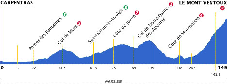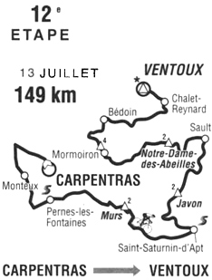 11h57 (Vaucluse) : D950 Carpentras (km 0) - Sarrians (km 5) - D31 Monteux (km 12) - D28 Pernes-les-Fontaines (km 22-sprint) - Saint-Didier (km 27) - D4 Venasque (près de) (km 32.5) - Col de Murs (km 41.5-GPM2) - Murs (km 47) - D2 Saint-Saturnin-les-Apt (km 61.5-sprint) - D943 Côte de Javon (km 75-GPM2) - D942 Sault (km 89) - D1 Col de Notre-Dame-des-Abeilles (km 99-GPM2) - Les Abeilles (km 99) - Villes-sur-Auzon (km 109.5) - D14 Mormoiron (km 115.5) - D224 Côte de Mormoiron (km 118-GPM4) - D974 Bédoin (km 126.5) - Le Chalet Reynard (km 142.5) - Stèle Tom Simpson (km 147.5) - Le Mont-Ventoux (km 149-GPM HC).