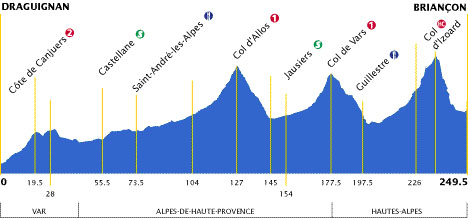 9h37 (Var) : D955 Draguignan (km 0) - Montferrat (km 11.5) - Côte de Canjuers (km 19.5-GPM2) - Comps sur Artuby (km 28) - (Alpes de Haute-Provence) : D952 Castellane (km 55.5-sprint) - Saint-André les Alpes (km 73.5-ravitaillement) - La Mure-Argens (km 78) - Thorame-Haute (km 86.5) - Beauvezer (km 99.5) - Villars-Colmars (près de) (km 102) - Colmars-les-Alpes (km 104) - Allos (km 112) - Col d'Allos (km 127-GPM1) - D902 Barcelonnette (km 145) - Jausiers (km 154-sprint) - La Condamine-Châtelard (km 160) - Les Gleizolles (km 162.5) - Saint-Paul sur Ubaye (km 169) - Col de Vars (km 177.5-GPM1) - (Haute-Alpes) : Les Claux (km 181) - Guillestre (km 197.5-ravitaillement) - D902 Arvieux (km 217) - La Casse Déserte / Stèle (km 226) - Col d'Izoard (km 228-GPM HC) - Cervières (km 237) - Serre-Chevalier 1200 (km 244.5) - Briançon / Champ de Mars (km 249.5).