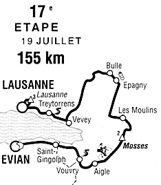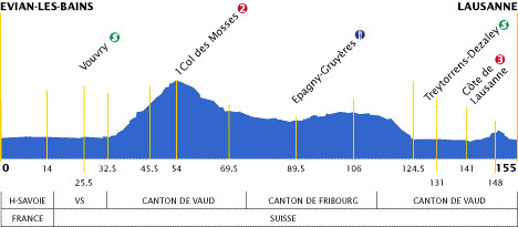 13h34 (Haute-Savoie) : N5 Évian-les-Bains (km 0) - Torronde (km 3) - Meillerie (km 8) - Saint-Gingolph (km 14) - (SUISSE) - douane (km 15.5) - (Canton du Valais) : Vouvry (km 25.5-sprint) - Vionnaz (km 28.5) - N11 Aigle (km 32.5) - Le Sepey (km 45.5) - Col des Mosses (km 54-GPM2) - L'Étivaz (km 60.5) - Les Moulins (km 67.5) - Rossinière (km 69.5) - (Canton de Fribourg) : Montbovon (km 76) - Albeuve (km 80) - Neirivue (km 81) - Villars-sous-Mont (km 82.5) - Enney (km 86) - Épagny-Gruyères (km 89.5-ravitaillement) - Bulle (km 92.5) - N12 Vuadens (km 95) - Vaulruz (km 98) - Semsales (km 106) - Châtel-Saint-Denis (km 111.5) - (Canton de Vaud) : Jongny (km 119) - Corsier (km 123) - Corseaux (km 124) - Vevey (km 124.5) - N9 Corseaux (km 124.5) - Saint-Saphorin (km 127.5) - Rivaz (km 128.5) - Treytorrens-Dezaley (km 131-sprint) - Villette (km 135) - Lutry (km 136.5) - Paudex (km 138) - Pully (km 138.5) - entrée circuit Lausanne (km 141) - Lausanne / 1er passage (km 143) - N1 Côte de Lausanne (km 148-GPM3) - Pully (km 152.5) - Lausanne/Av. de Rhodanie (km 155).
