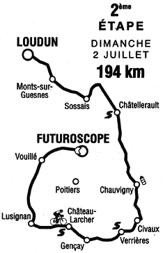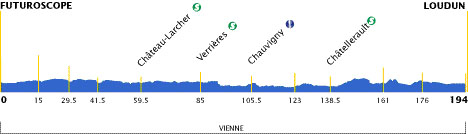 12h52 (Vienne) : Futuroscope / av. du Futuroscope (km 0) - Chasseneuil du Poitou - D62 Jaunay-Clan (km 0) - Neuville-de-Poitou (km 6) - Vouillé (km 16) - D7 La Chapelle-Montreuil (km 29.5) - N11 - D150 Lusignan (km 41.5) - Celle-Lévescault (km 49.5) - Vivonne (km 54.5) - Château-Larcher (km 59.5-sprint) - Marnay (km 64) - Saint-Maurice-La-Clouère (km 68.5) - D741 Gencay (km 69.5) - D2 Saint-Maurice-La-Clouère (km 70) - D13 Saint-Laurent-de-Jourdes (km 81.5) - Verrières (km 85-sprint) - D83 - Civaux (km 92.5) - D749R Ses (km 95.5) - Saint-Martin-La-Rivière (km 101.5) - Chauvigny (km 105.5-ravitaillement) - La Voûte (km 114.5) - Bellefonds (près de) (km 119) - Bonneuil-Matours (km 123) - N10 Châtellerault (km 138.5-sprint) - D22 Saint-Gervais-les-Trois-Clochers (km 155) - D42 Sossais (km 161) - D14 Orches (km 166.5) - Berthegon (km 171.5) - Monts-sur-Guesnes (km 176) - La Roche-Rigault (km 182.5) - entrée Loudun (km 190) - Loudun / av. de Ouagadougou (km 194).