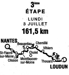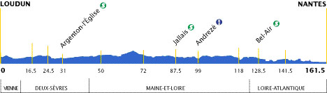 13h37 (Vienne) : D7 Loudun (km 0) - (Deux-Sèvres) : Pas-de-Jeu (km 8.5) - Orbe (près de) (km 16.5) - Thouars (km 21) - Vrines (km 24.5) - D61 Argenton-l'Église (km 31-sprint) - Humeau-Jouanne (km 37.5) - Saint-Pierre-à-Champ (km 41.5) - (Maine-et-Loire) : D54 Clère-sur-Layon (km 45.5) - Les Cerqueux-sous-Passavant (km 50) - D748 Vihiers (km 57.5) - D960 Le Coudray-Montbault (km 61.5) - D756 La Salle-de-Vihiers (km 66) - Melay (km 72) - Chemillé (km 75.5) - La Chapelle-Rousselin (km 81) - Jallais (km 87.5-sprint) - Beaupreau (km 96) - D752 Andrezé (km 99-ravitaillement) - Les Landes Fleuries (km 102.5) - D91 Saint-Macaire-en-Mauges (km 105.5) - D.63 Le Chêne-aux-Loups (km 114) - D762 Les Plantes - Montfaucon-sur-Moine (km 118) - Montigné-sur-Moine (km 120.5) - (Loire-Atlantique) : Bel-Air (km 128.5-sprint) - N149 Clisson (km 149) - D59 Gorges (km 134) - D7 Monnières (km 141.5) - D76 La Hautière (km 145.5) - D.59 Saint-Fiacre-sur-Maine (km 147) - Vertou (km 152.5) - entrée Nantes (km 157) - Nantes / Bd François Blancho (km 161.5)