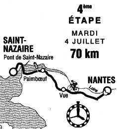 ONCE légèrement gênée à la sortie de Nantes en raison d'une manifestation et pénalisé de 20" l'emporte tout de même. L'équipe US POSTAL s'est désunie sur le pont de St-Nazaire.