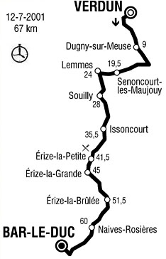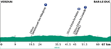 14h05 (Meuse) : Verdun (km 0) - Billemont (km 6) - Dugny-sur-Meuse (km 9) - Ancemont (km 13.5) - Senoncourt-lès-Maujouy (km 19.5) - Lemmes (km 24) - Souilly (km 28) - Heippes (km 32.5) - Issoncourt (km 35.5) - Chaumont-sur-Aire (km 41) - Érize-la-Petite (km 41.5-ravitaillement) - Érize-la-Grande (km 45) - Rosnes (km 48.5) - Érize-la-Brûlée (km 51.5) - Rumont (km 53) - Naives-Rosières (km 60) - Bar-le-Duc / entrée (km 63.5) - Bar-le-Duc / Bd. des Flandres (km 67).