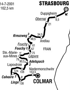 - En ce jour de 14 juillet, les coureurs français tentent leur chance. Tour à tour Agnolutto, Chanteur, N. Jalabert, Mengin, L. Jalabert attaquent sans succès. A l'arrière, Rinero est distancé et abandonne. Au km 19, Laurent Brochard parvient à s'extirper du peloton. Au km 21, il prend les 6" du sprint d'Obernai. Millar & Ivanov se lancent à sa poursuite et font la jonction au km 23.