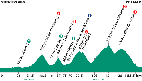 13h05 (Bas-Rhin) : Strasbourg - Lingolsheim (km 0) - Entzheim (km 4.5) - Duppigheim (km 8.5) - Duttleheim (km 10.5) - Altorf (km 13.5) - Griesheim-près-Molsheim (km 15) - Bischoffsheim (km 18.5) - Obernai (km 21-sprint) - Goxwiller (km 26) - Gertwiller (km 28.5) - Andlau (km 34.5) - Le Hohwald (km 43.5) - Col du Kreuzweg (km 48.5-GPM3) - Breitenbach (km 54) - Saint-Martin (km 56.5) - Ville (km 57.5) - Bassemberg (km 59.5) - Fouchy (km 61-sprint) - (Haut-Rhin) : Col de Fouchy (km 67-GPM3) - Rombach-le-Franc (km 71.5) - Lièpvre (km 75-sprint) - Ste-Marie-aux-Mines (km 79-ravitaillement) - Ribeauvillé (km 88) - Col d'Adelspach (km 90.5-GPM2) - Aubure (km 93) - Freland (km 100.5) - Hachimette (km 104.5) - Lapoutroie (près de) (km 108) - Le Bonhomme (km 111) - Col du Bonhomme (km 118) - Col du Calvaire (km 124-GPM2) - Collet du Linge (km 138-GPM3) - Trois-Épis (km 148) - Niedermorschwihr (km 153.5) - Ingersheim (km 156) - Colmar / entrée (km 158) - Colmar / Rte de Strasbourg (km 162.5).