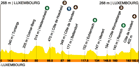 12h45 (LUXEMBOURG) - N12 Luxembourg (km 0) - Kopstal (km 5.5) - Côte des Quatre-Vents (km 8.5) - Tuntange (km 14.5-sprint) - N24 Useldange (km 23) - N22 Boevange-sur-Attert (km 26.5) - Colmar-Berg (km 34.5) - N7 Schieren (km 37) - Ettelbruck (km 39) - Heiderscheid (km 50-sprint) - CR308 Kehmen (km 55.5) - Bourscheid (km 57.5) - N27 Goebelsmuhle (km 62.5) - CR320 Hoscheid (km 69) - Côte de Hoscheid (km 69.5-GPM3) - Weiler (km 74) - Stolzembourg (km 78) - N10 Bivels (km 80.5) - Vianden (km 83.5-ravitaillement) - N17 Côte de Vianden (km 87-GPM4) - Bleesbruck (km 93.5) - N19 Bettendorf (km 96) - Reisdorf (km 99.5) - N10 Wallendorf/Pont (km 102.5) - Echternach (km 117.5-sprint) - CR141 Mompach (km 127.5) - Mertert (km 134) - N1 Grevenmacher (km 137.5) - Wormeldange (km 147) - CR122 Côte de Wormeldange (km 148.5-GPM3) - Remich (km 160-sprint) - E29 Bous (km 163.5) - N28 Oetrange (km 171.5) - CR132 Schrassig (km 172.5) - Niederanven (km 178) - Oberanven (km 179.5) - CR126 Côte de Hostert (km 182-GPM4) - N11 Luxembourg (km 189) - N7 Luxembourg/Rue des Glacis (km 192.5).