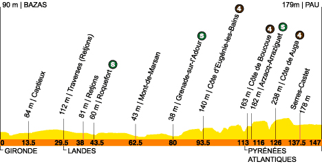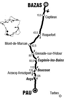 14h05 (Gironde) : D932 Bazas (km 0) - Bernos -Beaulac (km 4) - Captieux (km 13.5) - (Landes) : Retjons (près de) (km 38) - D932N Roquefort (km 43.5-sprint) - Lucbardez-et-Bargues (km 54.5) - N124 Mont-de-Marsan (km 62.5) - Saint-Pierre-du-Mont (km 68) - N124 Grenade-sur-l’Adour (km 80-sprint) - Larrivière (km 81.5) - Côte d'Eugénie-les-Bains (km 93.5-GPM4) - D111 Geaune (km 99.5) - Clèdes (km 102.5) - Pimbo (km 109) - (Pyrénées-Atlantiques) : Côte de Boucoue (km 113-GPM4) - D944 Arzacq-Arraziguet (km 116-sprint) - Vignes (km 117.5) - Méracq (km 120.5) - Côte d’Auga (km 126-GPM4) - Doumy (km 129.5) - Sauvageon (près de) (km 135) - Serres-Castet (km 137.5) - Lons (km 140.5) - Pau / Pl. de Verdun (km 147).