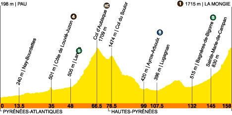 12h28 (Pyrénées-Atlantiques) : D37 Pau/Av. du Gal de Gaulle (km 0) - Mazères-Lezons (km 0.5) - Uzos (km 1.5) - Rontignon (km 2.5) - Narcastet (km 4) - Baliros (km 7) - Pardies-Piétat (km 9) - Saint-Abit (km 10) -Arros-de-Nay (km 11) - Nay-Bourdettes (km 13.5) - D36 Asson (km 17.5) - D35 Bruges-Capbis-Mifaget (km 23.5) - Mifaget (km 25) - Côte de Louvié-Juzon (km 35-GPM4) - D934 Louvie-Juzon (km 35.5) - Bielle (près de) (km 39.5) - Gère-Bélesten (km 42.5) - Laruns (km 48-sprint) - D918 Eaux-Bonnes (km 53) - Col d'Aubisque (km 66.5-GPM.HC) - (Hautes-Pyrénées) : Col du Soulor (km 76.5) - Arrens-Marsous (km 83.5) - Aucun (km 86.5) - Arras-en-Lavedan (km 92.5) - D100 Argelès-Gazost (km 95) - D13 Ayros-Arbouix (km 99-ravitaillement) - Boô-Silhen (km 102) - Lugagnan (km 107.5) - D26 Saint-Créac (km 109) - Juncalas (km 111) - Neuilh (km 123) - Trébons (km 129) - Pouzac (km 130) - D935 Bagnères-de-Bigorre (km 132-sprint) - Beaudéan (km 137.5) - Sainte-Marie-de-Campan (km 145) - D918 Artigues (km 152) - La Mongie/Pl. des Monges (km 158-GPM1).