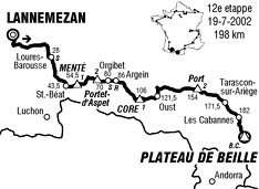 - Au passage du col de Port (km 155.5), le trio de tête possède encore 4'40" sur le peloton mais l'US Postal accélère de plus belle avant l'ascension du plateau de Beille. Aux 25 kilomètres, Jalabert, Dufaux, Nozal possèdent encore 4'20" puis 3'40" aux 20 km, 2'50" au pied des 16 kilomètres d'ascension vers le plateau de Beille. En tête, Jalabert distance Dufaux et Nozal à 13 bornes de l'arrivée tandis que derrière lui, Heras et Rubiera font exploser le peloton. Jalabert seul devant depuis 143 kilomètres est rejoint et lâché à 9 km de la ligne. Il terminera 49ème à 11'36".