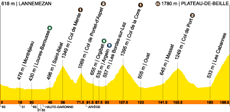 10h56 (Hautes-Pyrénées) : D939 Lannemezan (km 0) - D938 La-Barthe-de-Neste (km 2.5) - Escala (km 5) - Tuzaguet (km 8) - D26 Anères (km 10.5) - D75 Nestier (km 12) - Saint-Laurent-de-Neste (km 13.5) - Saint-Paul (km 16) - (Haute-Garonne) : N125 Montréjeau (km 19) - Gourdan-Polignan (km 22.5) - Labroquère (km 28) - (Hautes-Pyrénées) : Loures-Barousse (km 30-sprint) - Izaourt (km 31) - Bertren (km 32.5) - (Haute-Garonne) : Bagiry (km 35.5) - (Hautes-Pyrénées) : Saléchan (km 38.5) - (Haute-Garonne) : Estenos (km 39) - Chaum (près de) (km 41) - D44 Saint-Béat (km 45) - Boutx (km 48.5) - Col de Menté (km 56-GPM1) - D85 Couledoux (km 63.5) - Pont de l'Oule (km 67) - Col de Portet-d’Aspet (km 71.5-GPM2) - Portet-d'Aspet (km 73.5) - (Ariège) : Saint-Lary (km 77) - Orgibet (km 81.5-sprint) - Illartein (km 84) - Aucazein (km 85) - Argein (km 87.5-ravitaillement) - Audressein (km 89.5) - D4 Castillon-en-Couserans (km 91) - Les Bordes-sur-Lez (km 93) - Aret (km 96) - Samortein (km 97) - Col de la Core (km 107.5) - Sentenac-d'Oust (km 118.5) - D3 Seix (km 121) - Oust (km 123) - Soueix-Rogalle (près de) (km 126) - D618 Castet-d'Aleu (km 131) - Biert (km 139) - Massat (km 141.5) - Espiès (km 145.5) - Col de Port (km 155.5-GPM2) - Saurat (km 164.5) - Bedeilhac-et-Aynat (km 168) - Surba (km 170) - N20 Tarascon-sur-Ariège (km 172.5) - Ornolac-Ussat-les-Bains (km 176) - Bouan (près de) (km 179.5) - Sinsat (km 180) - D552 Les Cabannes (km 183) - Plateau de Beille (km 199.5-GPM HC).