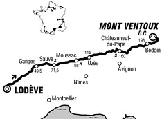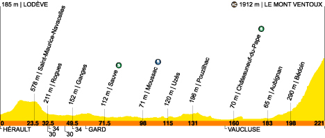 11h21 (Hérault) : N9 Lodève - Soumont (km 0) - Fozières (km 0.5) - D25 Soubès (km 3.5) - Saint-Étienne-de-Gourgas (km 6) - Saint-Pierre-de-la-Fage (km 13.5) - Saint-Maurice-Navacelles (km 23.5) - Madières (km 31) - (Gard) : Rogues (km 32.5) - (Hérault) : Gorniès (km 38) - (Gard) : La Papeterie (km 45.5) - (Hérault) : Cazilhac (km 49.5) - D999 Ganges (km 49.5) - Moulès-et-Baucels (km 53) - (Gard) : Saint-Hyppolite-du-Fort (km 63) - Sauve (km 71.5-sprint) - D8 Logrian-Florian (km 80) - Savignargues (km 85) - Nozières (km 95) - Brignon (km 96.5) - D982 Moussac (km 98-ravitaillement) - Garrigues (km 105.5) - Arpaillargues-et-Aureillac (km 111.5) - Uzès (km 115) - Saint-Hippolyte-de-Montaigu (km 123) - D101 Pouzilhac (km 131) - Saint-Victor-la-Coste (km 139) - Saint-Laurent-des-Arbres (km 143.5) - D26 Saint-Geniès-de-Comolas (km 146.5) - (Vaucluse) : D192 Châteauneuf-du-Pape (km 160-sprint) - D52 Bédarrides (km 165.5) - D55 Sarrians (km 177) - Aubignan (km 183) - Caromb (km 190) - Modène (km 192) - Saint-Pierre-de-Vassols (km 193) - D974 Bédoin (km 198) - Le Chalet-Reynard (km 214.5) - Stèle Tom-Simpson (km 219.5) - Le Mont-Ventoux (km 221GPM.HC).