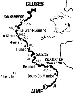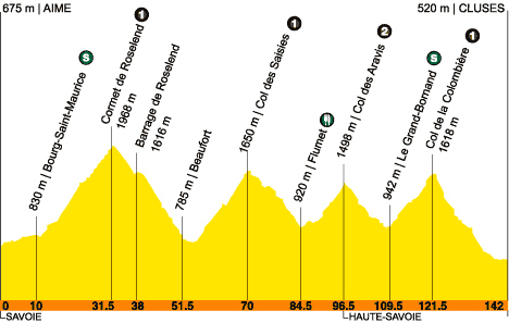 13h02 (Savoie) : N90 Aime (km 0) - Bonconseil (km 6.5) - D902 Bourg-Saint-Maurice (km 10-sprint) - D217 Cormet de Roselend (km 31.5-GPM1) - Barrage de Roselend (km 38) - D925 Beaufort (km 51.5) - D218B Les Saisies (km 68) - Col des Saisies (km 70-GPM1) - Notre-Dame-de-Bellecombe (km 81) - D 909 Flumet (km 84.5-ravitaillement) - La Giettaz (km 90) - Col des Aravis (km 96.5-GPM2) - (Haute-Savoie) : La Clusaz (km 103.5) - D4 Saint-Jean-de-Sixt (km 106) - Le Grand-Bornand (km 109.5-sprint) - Le Chinaillon (km 115) - Col de la Colombière (km 121.5-GPM1) - Le Reposoir (km 129) - Blanzy (km 135.5) - L’Étoile (km 136.5) - D304 Scionzier (km 137) - Cluses/Av. de Colomby (km 142).