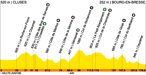 12h27 (Haute-Savoie) : D19 Cluses (km 0) - Thyez (km 0.5) - Marignier (km 3.5) - N203 Bonneville (km 12) - Toisinges (km 14) - Vozerier (km 18) - D155 La-Roche-sur-Foron (km 20) - Éteaux (km 22.5) - D27 Le Chaumet (km 31) - Menthonnex-en-Bornes (km 35) - Vovray-en-Bornes (km 37.5) - Côte des Bois-de-Serves (km 41-GPM3) - N201 Cruseilles (km 43-sprint) - Les Petits-Bois (km 44.5) - D27 Copponex (km 47.5) - D7 Grière (km 56) - Marlioz (km 56.5) - Côte de Marlioz (km 57.5-GPM4) - D992 Les Rippes (km 60.5) - Le Malpas (km 61.5) - Saint-Jean (km 63) - N508 Frangy (km 65) - Mons (km 69) - Vanzy (km 71.5) - Côte de la Sémine (km 74-GPM4) - D14 Chêne-en-Sémine (km 76.5) - Franclens (km 78) - (Ain) : D72a Génissiat (km 84.5-ravitaillement) - D30 Injoux-Génissiat (km 86.5) - Col de Richemont (km 96-GPM1) - D9 Hotonnes (km 103.5) - D31 Ruffieu (km 106.5) - Le Petit Abergement (km 111.5-sprint) - Col de la Cheminée (km 115-GPM3) - D12 St-Martin-du-Frêne (km 130) - Maillat (km 133) - Côte de Giriat (km 137-GPM4) - D11 Peyriat (km 138) - D979 Nurieux-Volognat (km 142) - Col du Berthiand (km 147.5-GPM2) - Pont de Serrières-sur-Ain (km 154) - Hautecourt (km 157.5) - Bohas (km 161) - Ceyzériat (km 167.5) - Saint-Just (km 171.5) - N79 Bourg-en-Bresse/entrée (km 172.5) - Bourg-en-Bresse/Bd. Lévrier (km 176.5).