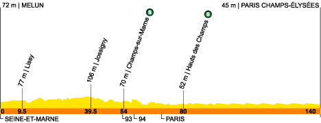 13h30 (Seine-et-Marne) : D35 Melun/Rte de Voisenon (km 0) - Voisenon (km 1) - Montereau-sur-le Jard (km 3.5) - Courseaux (km 5) - D471 Lissy (km 9.5) - Soignolles-en-Brie (km 12.5) - D96 Coubert (km 14.5) -D10 Villepatour (km 19.5) - Combreux (km 24) - Tournant-en-Brie (km 26.5) - Favières (km 30.5) - Jossigny (km 39.5) - D217b Guermantes (km 43.5) - Conches-sur-Gondoire (km 44.5) - Gouvernes (km 44.5) - Bussy-Saint-Martin (près de) (km 46) - Saint-Thibault-des-Vignes (km 47) - Torcy (km 48.5) - Noisiel (km 50.5) - N370 Champs-sur-Mame (km 54-sprint) - (Seine-Saint-Denis) : D330 Noisy-le-Grand (km 55) - (Val-de-Marne) : N303 Villiers-sur-Mame (km 59) - Bry-sur-Marne (km 60) - Champigny-sur-Marne (km 61) - N4 Joinville-le-Pont (km 64.5) - Saint-Maurice (km 68.5) - Charenton-le-Pont (km 69) - (Paris) : Quai de Bercy (km 72.5) - Quai de la Râpée (km 73.5) - Bd. Henri-IV (km 74.5) - Place de la Bastille (km 75.5) - Rue de Rivoli (km 76) - Hôtel de Ville (km 77) - Entrée circuit (km 78.5) - Place de la Concorde (km 79) - 1er passage ligne d’arrivée (km 79.5) - Haut des Champs-Élysées (km 81-sprint) - 2e passage ligne d'arrivée (km 86) - 3e passage (km 92.5) - 4e passage (km 95.5) - 5ème passage (km 102) - 6e passage (km 108.5) - 7e passage (km 115) - 8e passage (km 121.5) - 9e passage (km 128) - 10e passage (km 134.5) - Paris/Champs-Élysées (km 144).