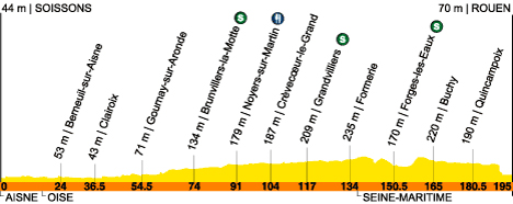 (Oise) : D81 Bitry (km 18) - Attichy (km 20) - Berneuil-sur-Aisne (km 24) - Rethondes (km 29) - Choisy-au-Bac (km 34.5) - Clairoix (km 36.5) - N32 (Compiègne) (près de) (km 38.5) - Bienville (km 40.5) - Coudun (km 41.5) - Giraumont (près de) (km 43) - D41 Villers-sur-Coudun (km 41) - D73 Braisnes (km 46) - Monchy-Humières (km 48) - Gournay-sur-Aronde (km 54.5) - Neufvy-sur-Aronde (km 56) - Wacquemoulin (km 59.5) - Saint-Martin-aux-Bois (km 64) - Maignelay-Montigny (km 69) - D23 Brainvillers-La Motte (km 74-sprint) - Quinquempoix (km 76.5) - Ansauvillers (km 79.5) - Wavignies (km 83) - Thieux (km 86) - Noyers-sur-Martin (km 91-ravitaillement) - D151 Froissy (km 93) - Crèvecoeur-le-Grand (km 104) - Hétomesnil (km 109) - Grandvilliers (km 117-sprint) - Feuquières (km 124.5) - Monceaux l'Abbaye (km 129.5) - Bouvresse (km 132.5) - D316 Formerie (km 134) - (Seine-Maritime) : Gaillefontaine (km 143) - Forges-les-Eaux (km 150.5-sprint) - D919 Bosc-Bordel (km 161.5) - Buchy (km 165) - Saint-Martin-du-Plessis (près de) (km 167) - D928 Vert-Galant (km 177) - Quincampoix (km 180.5) - Isneauville (km 183.5) - Bois Guillaume (km 187.5) - Bihoral (près de) (km 189.5) - Rouen/entrée (km 190) - Rouen (km 195).