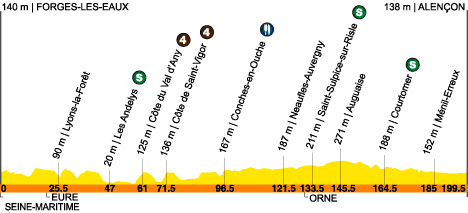 12h20 (SEINE-MARITIME) : D921 Forges-les-eaux (km 0) - La Ferté-Saint-Samson (km 1) - Argueil (km 5) - Fry (km 7) - Mesnil-Lieubray (km 8.5) - Nolleval (km 12.5) - La Feuillie (km 17) - (EURE) : D321 Le Tronquay (km 22) - La Lande-Saint-Ouen (km 23) - Lyons-la-Forêt (km 25.2) - D2 Lisors (près de) (km 33) - Écouis (km 37.5) - Fresne-L'Archevêque (km 41.5) - D316 Les Andelys (km 47-sprint) - D313 Vezillon (près de) (km 48.5) - Bouafles (près de) (km 52) - D316 Courcelles-sur-Seine (km 54.5) - Aubevoye (km 56) - Gaillon (km 57) - Côte du Val d'Any (km 61-GPM4) - Autheuil-Authouillet (km 67.5) - Saint-Vigor (km 69) - Côte de Saint-Vigor (km 71.5) - Caer (km 77.5) - D155 Gravigny (km 78.5) - Évreux (km 80.5) - D830 Saint-Sébastien-de-Morsent (km 87) - La Bonneville-sur-Iton (près de) (km 92) - Conches-en-Ouche (km 96.5-ravitaillement) - D830 (km 98.5) - La Vieille-Lyre (km 115) - La Neuve-Lyre (km 116) - Neaufles-Alvergny (km 121.5) - Ambenay (km 124) - Rugles (km 126.5) - (ORNE) : D930 Saint-Martin d'Ecublei (km 131) - Saint-Sulpice-sur-Risle (km 133.5/sprint) - D919 L'Aigle (km 135.5) - N26 (km 139.5) - D3 Auguaise (km 145.5) - La Ferrière-au-Doyen (km 151.5) - Moulins-La-Marche (km 154) - Courtomer (km 164.5-sprint) - D31 Essay (km 178) - Menil-Erreux (km 185) - Larre (km 187) - Semallé (près de) (km 190.5) - D112 Alençon/entrée (km 195) - Alençon/Rue de Bretagne (km 199.5).